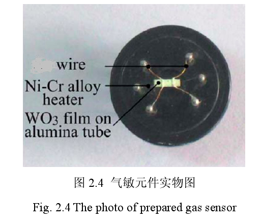 制備出納米WO3樣品后便對(duì)樣品進(jìn)行乙醇?xì)怏w氣敏性能測(cè)試,對(duì)比不同樣品的氣敏性能參數(shù)。在進(jìn)行氣敏性能測(cè)試之前,應(yīng)制取氣敏元件。氣敏元件的示意圖和實(shí)物圖如圖2.3和2.4所示,主體為一個(gè)外徑為1.2mm的空心的氧化鋁陶瓷管,陶瓷管兩端有兩個(gè)相距6mm的Au電極,兩個(gè)電極上分別連接有兩根Pt導(dǎo)電細(xì)線。在氧化鋁陶瓷管中間,穿過一條Ni-Cr合金加熱絲,可以通過對(duì)此加熱絲通電,達(dá)到加熱氧化鋁陶瓷管的目的。