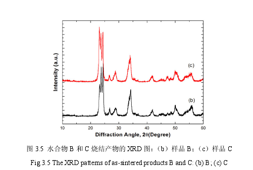 為方便描述,我們將采用CTAB作為輔助劑水熱制備出的產(chǎn)物標(biāo)記為a將利用草酸輔助合成的產(chǎn)物標(biāo)記為水合物B。為了提高WO3在氣敏測試過程中的穩(wěn)定性,需將含有結(jié)晶水的WO3即W03·H20進行燒結(jié)以便去除結(jié)晶水而產(chǎn)生穩(wěn)定的納米WO3結(jié)構(gòu)。我們在4500C的溫度下,將水合物B和C燒結(jié)5小時。經(jīng)過燒結(jié)后W03·H20從艷黃色粉末變?yōu)榈S色粉末。圖3.5展示了水合物B和C經(jīng)過燒結(jié)后的XRD圖譜,其主要衍射峰與標(biāo)準(zhǔn)卡N0.43-1035相符合,并無其他雜峰出現(xiàn),表明樣品B和C為純凈的單斜相WO3。經(jīng)過燒結(jié)后的水合物B和C得到了樣品B,察對比發(fā)現(xiàn),燒結(jié)對樣品的微觀形貌影響很小,經(jīng)過觀其保持了燒結(jié)前的尺寸和形貌。