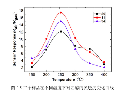 本次試驗(yàn)中對(duì)三個(gè)樣品的氣敏測(cè)試主要針對(duì)還原性氣體乙醇。眾所周知,在氣敏測(cè)試過(guò)程中,外界條件如溫度、濕度以及氣體濃度對(duì)氣敏原件的響應(yīng)有著極其重要的影響。因此,我們首先在一定氣體濃度和濕度下對(duì)三個(gè)樣品在150-400℃溫度范圍內(nèi)對(duì)乙醇?xì)怏w進(jìn)行了測(cè)試。不同溫度下S0, S1和S4對(duì)一定濃度的乙醇的響應(yīng)如圖4.8所示,從圖中可以看到,三個(gè)樣品在不同溫度下對(duì)乙醇?xì)怏w均有一定的響應(yīng),并且在150-250℃溫度范圍內(nèi),隨著溫度的升高響應(yīng)值也隨之增加,但達(dá)到250℃的最合適溫度后,當(dāng)繼續(xù)增加溫度時(shí),響應(yīng)值又開(kāi)始降低。因此,本測(cè)試中所得的氣敏元件最佳工作溫度為250℃。通過(guò)測(cè)試系統(tǒng)的計(jì)算,在250℃下,樣品S0, S1和S4的響應(yīng)值分別為12.20, 17.54和15.04,其中S1表現(xiàn)出最好的靈敏度。 在250℃時(shí),三個(gè)樣品對(duì)乙醇?xì)怏w的動(dòng)態(tài)響應(yīng)一恢復(fù)曲線如圖4.9所示,經(jīng)過(guò)氣體的引入和釋放我們可以看到,釋放后三個(gè)樣品的電阻都能基本恢復(fù)到初始電阻。同時(shí),從這個(gè)典型的呈“幾”字型響應(yīng)一恢復(fù)動(dòng)態(tài)曲線可以看到,三個(gè)樣品在250℃均對(duì)乙醇?xì)怏w表現(xiàn)出良好的響應(yīng)恢復(fù)性能。 該氣敏性能可以用目前最為廣泛的氣敏機(jī)理模型一一化學(xué)吸附、脫附模型來(lái)解釋。WO3納米材料對(duì)乙醇?xì)怏w的氣敏機(jī)理分析如第三章所述。三個(gè)樣品的氣敏性能差異主要?dú)w因于其形貌和結(jié)晶相的差異。SO主要是由不規(guī)則的納米片和納米顆粒組成,在實(shí)際應(yīng)用中,這些納米顆粒傾向于發(fā)生團(tuán)聚,嚴(yán)重影響了納米材料與檢測(cè)氣體的接觸面積。雖然納米片相互堆積容易形成氣體分子通道,但其中的納米顆粒也容易塞積在這些由納米片組成的通道,阻止表面的氣體分子向內(nèi)部擴(kuò)散。而對(duì)于S1樣品,其獨(dú)有的三維立體結(jié)構(gòu)能使樣品極不容易團(tuán)聚,另外S1中球狀結(jié)構(gòu)在燒結(jié)后聚集的納米塊變得松散,因此存在大量的空隙結(jié)構(gòu)。S4中片狀結(jié)構(gòu)上的縫隙和粗糙表面,這些都有利于其與檢測(cè)氣體的接觸和反應(yīng),從而提高靈敏度。不同的結(jié)晶相對(duì)性能也有一定的影響,可能在一定程度上,S1和S4混合的單斜和六方的混合相比SO中純的六方相更合適于與被檢測(cè)氣體反應(yīng)。而S1和S4氣敏性能差異則很可能歸因于S1的更大比表面積以及S1中更有優(yōu)勢(shì)的單斜和六方相WO3的相對(duì)含量。