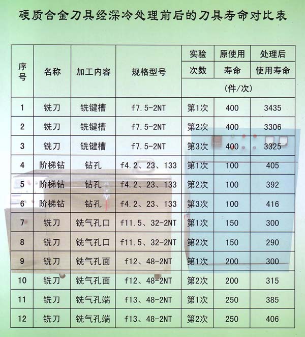 硬質合金刀具經(jīng)深冷處理前后的刀具壽命對比表