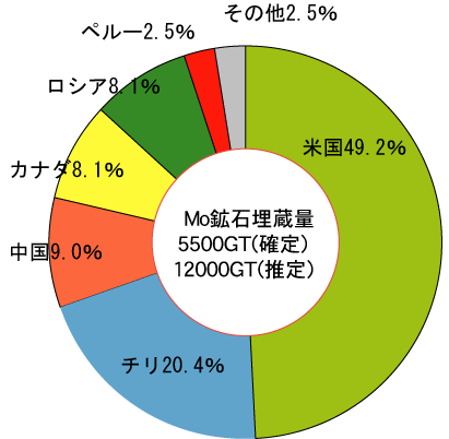 確定埋蔵量:550百萬トン・Mo (推定埋蔵量1200百萬トン・Mo) *出典:U.S.Geological Survey,Mineral Commodity Summaries,January 1998 | |