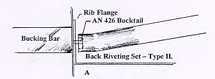 If possible, skins should be back riveted. This process provides cosmetic (and some structural) protection to the outer skin. Some locations will permit access for use of the spring loaded (type I) back riveting set. On others, such as wing ribs, a special long back set having an angled face is used to back set rivets. In either case, a partner uses a polished, 3" diameter back riveting bar (plate) to buck rivet heads from the outer side of the skin.