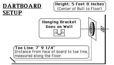 Board Setup The board setup is really quite simple. Mount the dart board on a wall with the center of the double bull 5 feet 8 inches from the floor. Place the oche or toe-line 7 feet 91/4 inches from the board. (Remember to take into account the dart board width when measuring the line---a bristle dart board has a width of approximately 11/2 inches) There are a few rules that are common to all games unless otherwise stated. To decide who shoots first, both players shoot for the bulls-eye with the closest to the bull shooting first and alternating thereafter. A turn consists of three darts and the players must shoot from behind the toe-line or oche. The point of the dart must be touching the board to count. Darts that miss the board or bounce to the floor do not score and cannot be re-thrown. However, a player may pick up and play a dropped dart.