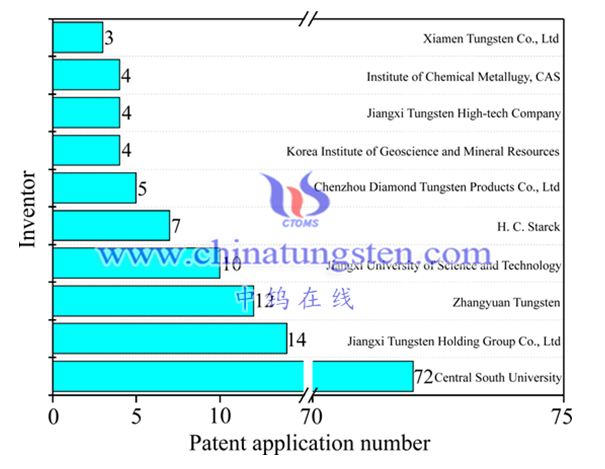 Main domestic applicants and patent applications number of tungsten metallurgy (by 2016)