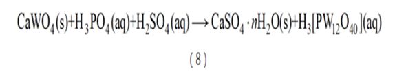 The sulfur-phosphorus mixed-acid synergistic processing technology of scheelite launched by Central South University uses cheap sulfuric acid as the main leaching agent and does not produce alkali cooking waste residue. Its market share is gradually increasing. During leaching, calcium in scheelite combines with sulfuric acid to form gypsum and enters the slag phase, while tungsten complexes with phosphoric acid to form phosphotungstic heteropoly acid and enters the liquid phase (see reaction equation (8)). The thermodynamic driving force in the leaching process is large, and the calcium sulfate crystal form of the leaching product is coarse and difficult to form packages, so the process can be carried out under normal pressure conditions. In addition, the gypsum leaching residue can be used as cement filler. After the tungsten is extracted, the leachate is supplemented with acid and returned to the leaching solution, thus solving the problem of waste residue and wastewater discharge and becoming a new generation of clean smelting process for tungsten.