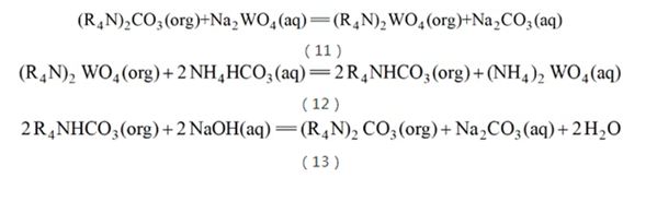 Quaternary ammonium salt extractant is a strong alkaline extractant and can be extracted under alkaline conditions. Quaternary ammonium salt extraction of tungsten was first invented by the Soviets. Different from China, the Soviet Union has always had a soda pressure cooking process to process tungsten ore. During soda pressure cooking, the tungsten in the tungsten ore enters the solution in the form of tungsten. Since the soda pressure cooking process requires the use of a vast excess of soda, a considerable amount remains in the leachate, causing harmful emissions. In order to change this phenomenon, in the late 1980s, Soviet metallurgists developed a method of alkaline extraction of quaternary ammonium salts. Since the order of affinity of quaternary ammonium salts to anions is from large to small, the loaded quaternary ammonium salt extractant can be used to contact the solution, so that it is extracted into the organic phase, and the exchanged CO32? enters the raffinate. , the raffinate can be returned to the next step of pressure cooking (see reaction equation (11)) when the soda is replenished, thus significantly reducing the emission of harmful salts. In the next step, the organic phase loaded with tungsten is contacted with the NH4HCO3 solution. Since the affinity of HCO3? with the organic phase is greater than that of WO42?, the tungsten is stripped down to form an ammonium tungstate solution (see reaction equation (12)). Subsequently, the extraction agent needs to be contacted with an alkaline solution so that the HCO3? loaded in the organic phase is neutralized by NaOH. Due to the weak affinity with the organic phase, the organic phase regains its ability to extract tungsten and enters the next cycle of operation (see reaction equation (13)). After entering the 21st century, in-depth research has been carried out in China on this basis, and the process has been industrialized in Luanchuan, Henan.