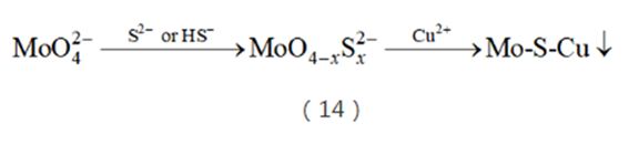 Inspired by the chemical research on Mo(W)-Cu(Ag)-S clusters, metallurgists proposed a new process of "selective precipitation to deeply remove molybdenum from tungstate solution." Still through sulfidation, Mo is converted to W while W still exists; Cu2+ or Cu(OH)2 is then added to precipitate and remove Mo in the form of thiomolybdate (formula (14)).