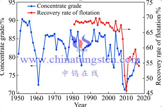 Trend line of tungsten concentrates grade and recovery rate of flotation in China from 1950 to 2017