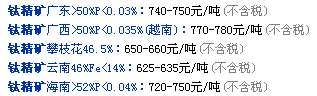 今日國(guó)內(nèi)各地區(qū)鈦精礦價(jià)格具體情況如下: