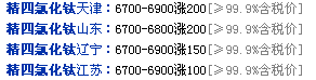 今日國(guó)內(nèi)各地區(qū)精四氯化鈦價(jià)格具體情況如下: