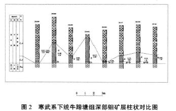 二、礦區(qū)地質(zhì)特征 1.地層 礦區(qū)內(nèi)出露有上震旦統(tǒng)及下寒武統(tǒng)。下寒武統(tǒng)牛蹄塘組底部黑色巖系中賦存有鎳鉬多元素礦化層,該層是開(kāi)展鉬礦找礦的目的層。 (1)震旦系上統(tǒng)燈影組() 巖性以灰白色白云巖為主,節(jié)理較發(fā)育。底部為薄層破碎泥質(zhì)白云巖,下部為鮞狀、假鮞狀白云巖,中部為礫狀白云巖,上部為灰白色中厚層狀中一粗粒結(jié)晶自云巖,頂部為含硅質(zhì)白云巖;白云巖頂面可見(jiàn)到侵蝕坑洼和白云巖與上覆磷塊巖之間的微角度不整合以及上覆巖層超覆等現(xiàn)象,局部可見(jiàn)到褐鐵礦的透鏡體。厚320~400米。 (2)寒武系下統(tǒng)牛蹄塘組() ①含礦層(),厚2~6米。 a.磷塊巖層:淺灰至黝黑色,薄層狀或塊狀構(gòu)造,質(zhì)堅(jiān)性脆,局部夾白云巖透鏡體。礦物成分主要為膠磷礦,次為泥質(zhì)、硅質(zhì)及白云石等。呈透鏡狀分布,局部有尖滅現(xiàn)象。與下伏燈影組呈假整合接觸。 b.鱗片狀黑色頁(yè)巖:鱗片狀結(jié)構(gòu),性軟易成鱗片,層理不發(fā)育,鱗片多具亮黑色,疏松易成粉末,富含磷質(zhì)硅泥質(zhì)、黃鐵礦等多種結(jié)核及金屬硫化物條帶,層厚1~10厘米,一般l~3厘米,大部分只有一層,局部可見(jiàn)2~3層,斷續(xù)分布,極不連續(xù)。巖石的主要成分為水云母,次為炭質(zhì)、有機(jī)質(zhì)及黃鐵礦。局部夾薄層硅質(zhì)巖層,該層為主要的鋁礦層。 c.頁(yè)片狀炭質(zhì)頁(yè)巖夾薄板狀炭質(zhì)頁(yè)巖透鏡體。 d.鱗片狀高炭質(zhì)頁(yè)巖。 ②黑色頁(yè)片狀炭質(zhì)頁(yè)巖():間夾硅質(zhì)團(tuán)塊和硅質(zhì)粉砂質(zhì)頁(yè)巖,風(fēng)化后呈書(shū)頁(yè)狀,厚3.28~6.00米。 ③黑色板狀炭質(zhì)頁(yè)巖():中厚層狀、含硅質(zhì)結(jié)核中含較多黃鐵礦和海棉骨針化石,風(fēng)化后呈球形脫離,厚8.0~10.0米。 ④黑色薄層板狀灰質(zhì)頁(yè)巖():其成分以泥質(zhì)為主,灰質(zhì)、炭質(zhì)次之,具微層理構(gòu)造,風(fēng)化后呈灰白色,厚14~18米。 (3)寒武系下統(tǒng)把榔組() 下部為灰色、灰黃色水云母頁(yè)巖,泥質(zhì)結(jié)構(gòu),含有白云母及鈣質(zhì)結(jié)核,頁(yè)理不發(fā)育,節(jié)理發(fā)育,下部夾淺灰色白云質(zhì)頁(yè)巖條帶;風(fēng)化后為黃色碎片。厚約70~120米。 上部為鈣質(zhì)頁(yè)巖,灰綠色,其成分以泥質(zhì)為主,含白云母,常夾有鈣質(zhì)結(jié)核和鈣質(zhì)透鏡體,其透鏡體厚0.5~3米,風(fēng)化后成橢球狀。厚約50~70米。 (4)寒武系下統(tǒng)清虛洞組() 下段為灰色薄一中層泥質(zhì)灰?guī)r、中厚層灰?guī)r,厚116米;中段為含鉀頁(yè)巖(白云巖、鈣質(zhì)頁(yè)巖),含5.17%~6.49%,厚26米;上段為灰?guī)r及白云巖,厚117米。 (5)第四系(Q) 為沖積層、殘坡積層,由前述地層基巖風(fēng)化形成的碎片、砂泥礫石等組成,厚0~20米。 2.構(gòu)造 礦區(qū)位于古丈背斜北東傾沒(méi)端的次一級(jí)向斜的南翼,構(gòu)造總體簡(jiǎn)單,呈北傾的單斜層產(chǎn)出,產(chǎn)狀平緩,傾角一般在10°~15°。在礦區(qū)南部,斷裂構(gòu)造相對(duì)發(fā)育,主要有北西西向的F5、北北東向的F2及北東向F6等斷層。 (1)F5正斷層 分布于黃家棚附近(北側(cè)),走向280°左右,傾向北東,傾角約60°,延伸長(zhǎng)800余米,垂直斷裂40米左右,上盤(pán)下降,牛蹄塘組炭質(zhì)頁(yè)巖與燈影組白云巖呈斷層接觸,破壞了礦層的完整性,對(duì)礦層有一定的影響。 (2)F2逆斷層 分布于黃家棚附近(東側(cè)),走向10°左右,傾向西,延伸長(zhǎng)1500余米,斷距30~50米,切割F5及震旦系、寒武系,導(dǎo)致礦層在走向上不連續(xù)。 (3)F6正斷層 見(jiàn)于彭家崗南南西側(cè),斷層走向70°左右,斷距較小,局部影響礦層的連續(xù)性。 3.巖漿巖 區(qū)內(nèi)無(wú)巖漿巖體出露,有輕微熱液活動(dòng)。