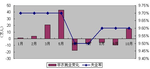 周五晚,美國(guó)勞工部公布10月份非農(nóng)就業(yè)數(shù)據(jù),10月非農(nóng)就業(yè)人口意外增加15.1萬人,遠(yuǎn)高于預(yù)期,其中私營(yíng)部門就業(yè)人數(shù)增加15.9萬人,預(yù)期增加 7.5萬人,創(chuàng)下今年4月以來最大月度漲幅。但失業(yè)率為9.6%,與預(yù)期持平,為連續(xù)第三個(gè)月維持在此高位。單憑此次非農(nóng)數(shù)據(jù)趨好斷言就業(yè)市場(chǎng)好轉(zhuǎn),為時(shí) 尚早。在美聯(lián)儲(chǔ)剛公布6000億美元二次量化的背景之下,數(shù)據(jù)對(duì)市場(chǎng)影響有限,難以從根本上提振美元。