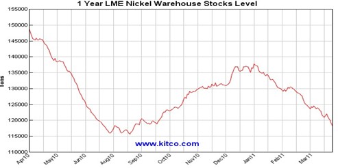 3. 2010年中國市場鎳庫存減少約6.5-7萬噸,2011年前2月減少了約2萬噸。據(jù)此,我們估算2010年中國市場鎳實(shí)際消費(fèi)量約60萬噸,高于此前估計(jì)的50萬噸。