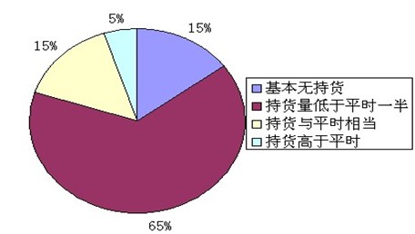 本周調(diào)研的上海地區(qū)貿(mào)易商持貨情況中,15%基本無持貨,65%持貨量低于平時(shí)的一半,約15%持貨量與平時(shí)差不多;另有5%持貨高于平時(shí)。